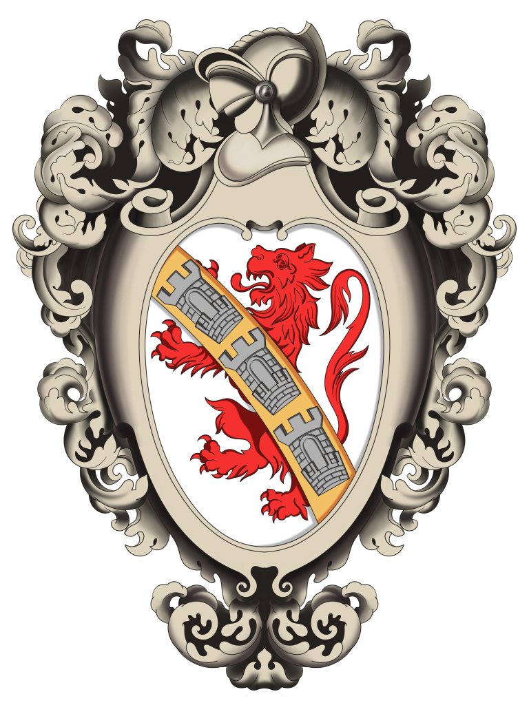 Armas: En campo de plata, un león de gules. Banda brochante de oro, cargada de tres torres de acero.